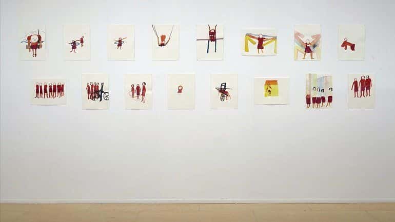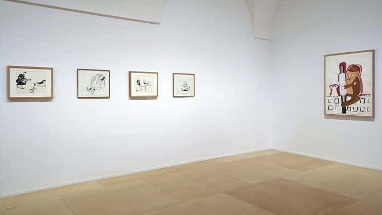 Podremos ver la evolución de su carrera a lo largo de los cuadros de la muestra desde los dibujos iniciales marcados por la sobriedad lineal y anti-pictórica hasta en los que el color cobra protagonismo a finales de los noventa. El color de las primeras experiencias sirve de relleno para la línea, pero pronto la artista empieza a diferenciar trazo y mancha para dar paso tanto a la policromía como al plano monocromo con los que amplía el repertorio temático, abordando la fábula en La bella y la bestia (2009) para regresar al cuerpo y al