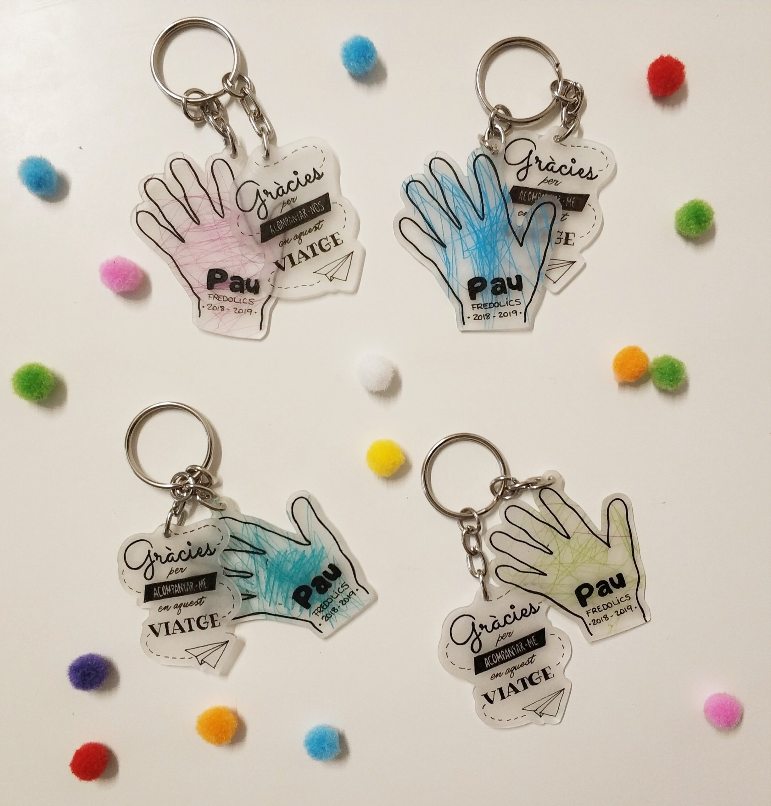Cortaremos un trozo y dejaremos que el peque lo pinte cómo quiera o una buena idea es hacer la forma de su mano y que él la pinte, pero eso imaginación de cada. El siguiente paso es recortarlo todo dejando unos milímetros alrededor y hacer el agujero por el que luego irá la anilla. Cuando esté listo es hora de introducirlo e el horno precalentado a 150 grados, habrá que dejar la obra de arte hasta que esté más pequeña y plana. El proceso es tanto curioso debido a que se empieza a deformar pero luego acaba de forma plana. Cuando estén listas tac sacarlas del horno y ponerlas en una superficie plana para que queden perfectas.